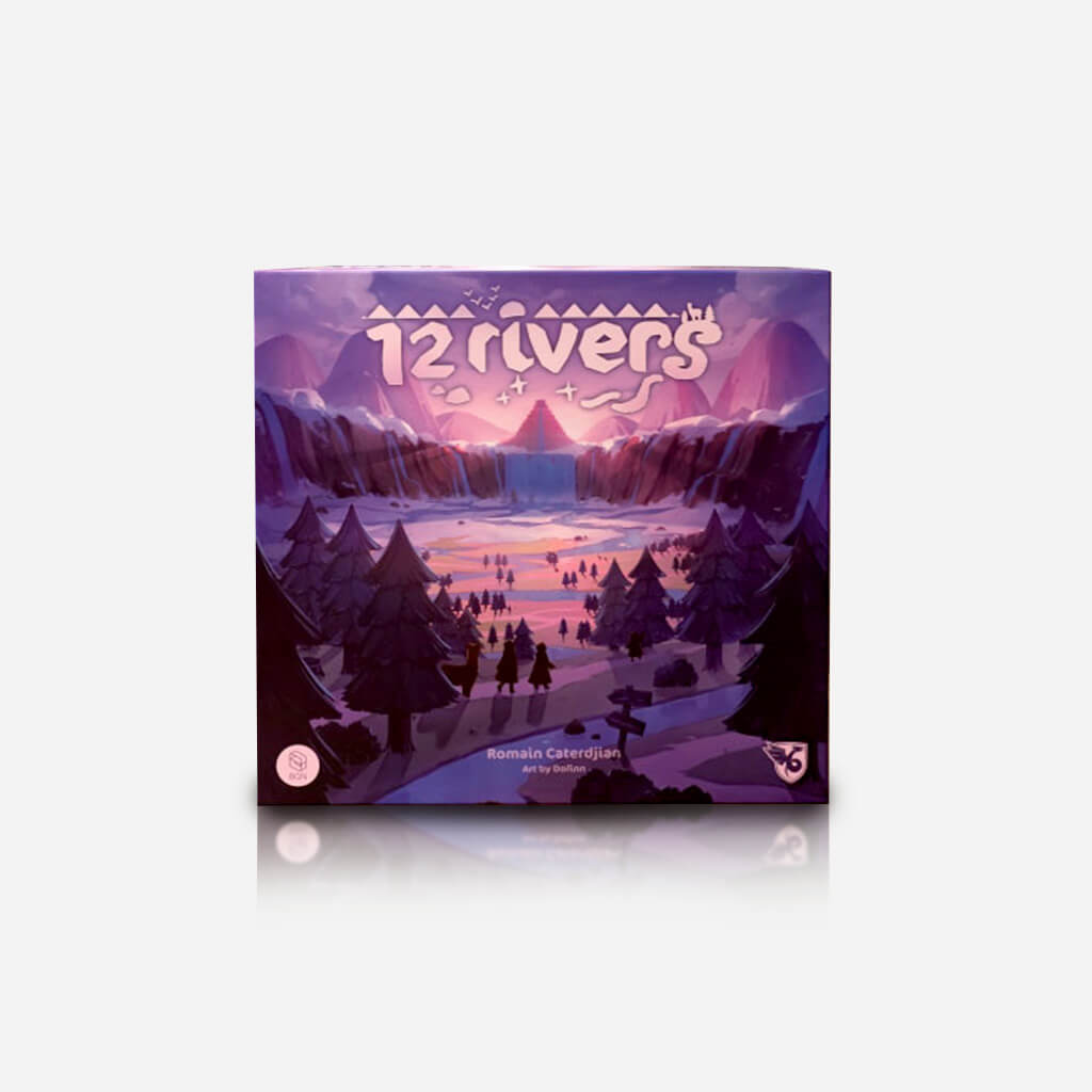 In each of 5 rounds of play, take turns paying camp cards (resources) to place your 3 tribe tokens into various slots along the rivers, to get the magic pearls you need. Pay more camp card resources to place higher up the rivers to pick pearls earlier. However, with clever placement and use of camp card powers, you can still get valuable pearls efficiently downstream. Use your Tribe tokens to block then collect magic pearls that flow down the 12 rivers. Collect pearls needed by villagers to ensure prosperity for the village at the bottom of the 12 Rivers.
