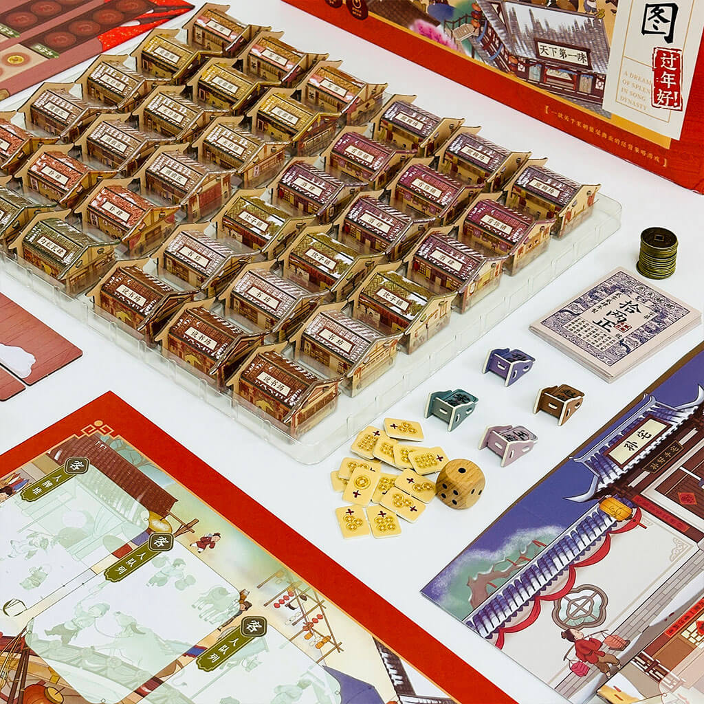 穿越北宋繁华汴京,开启你的商业致富之路!「大宋百商图:豪华版 – 新春版(过年好)」是一款以宋朝市井生活为背景的策略经营类桌游。玩家化身少东家,通过开店铺、研发菜品、招客人、遇事件等方式积累财富,重建街巷荣景,最终成为汴京首富。