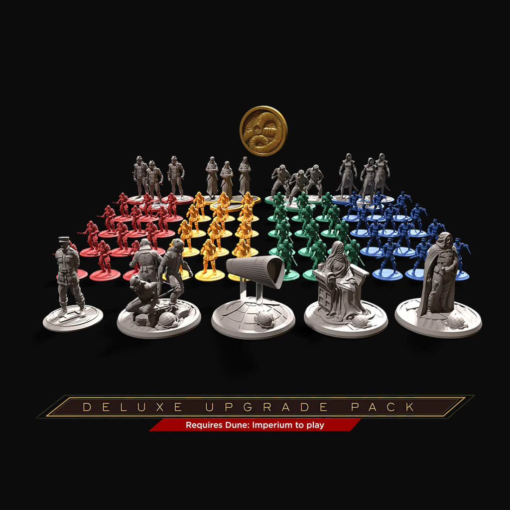 Enhance your Dune: Imperium experience with the Deluxe Upgrade Pack! This cosmetic expansion upgrades the components of the base game for a more immersive experience. The contents come in an oversized box with plastic storage trays that store the whole game (including sleeved cards).