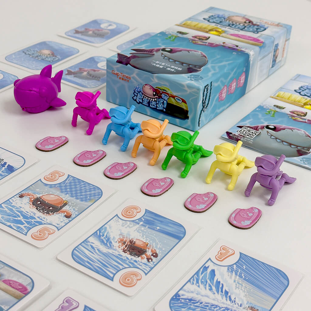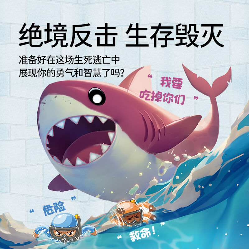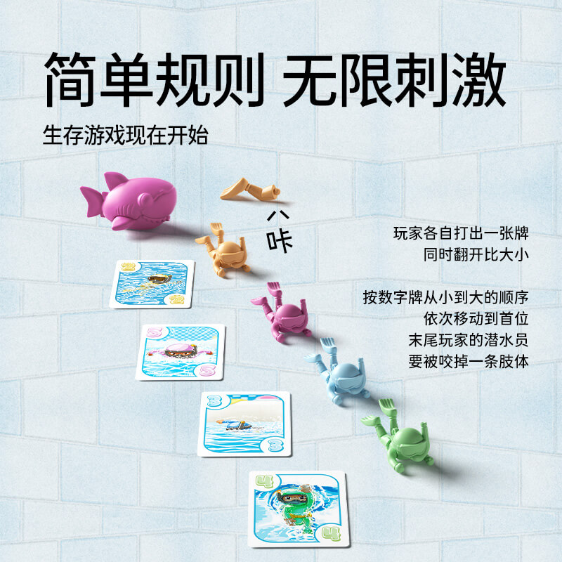 玩家们将化身为勇敢的潜水员,拼尽全力避开一只饥饿的鲨鱼!每位玩家操控一名潜水员,在充满危险的海底冒险中生存。游戏的独特之处在于,每回合都会有一名潜水员被鲨鱼抓住,而这名倒霉者通常是排在最后的玩家。