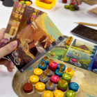 Placement of the terrain tokens will depend on the personal Animal card goals, and scoring rules for the various terrain types (mountain, field, forest, etc). For example, mountain tiles score based on how high they are (1 tile scores 1, while 3 tiles stacked score 7), but the mountain scores zero if it is not adjacent to at least one other mountain. If all the cubes on a given Animal card have been placed, the card is set aside and a new card can be drawn. The cards are scored at game end based on the highest number that isn’t covered by a cube.