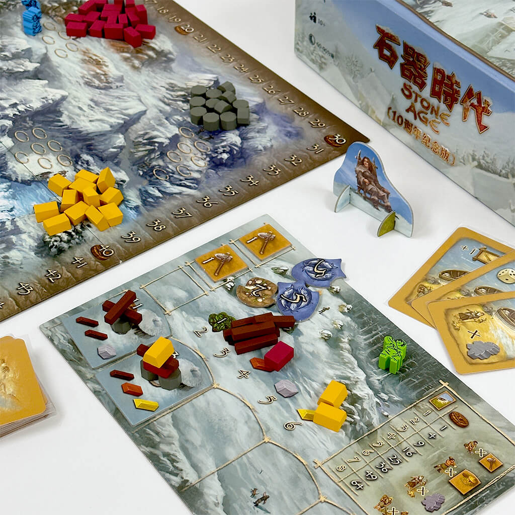 「石器时代10周年纪念版」是经典工人放置策略游戏《石器时代》的限量纪念版本,适合2至4名玩家,游戏时间约为60至90分钟,推荐10岁及以上玩家共同体验。在游戏中,玩家将化身为石器时代部落的首领,带领族人采集资源、发展农业、建造房屋,并在恶劣环境中努力生存与繁荣。