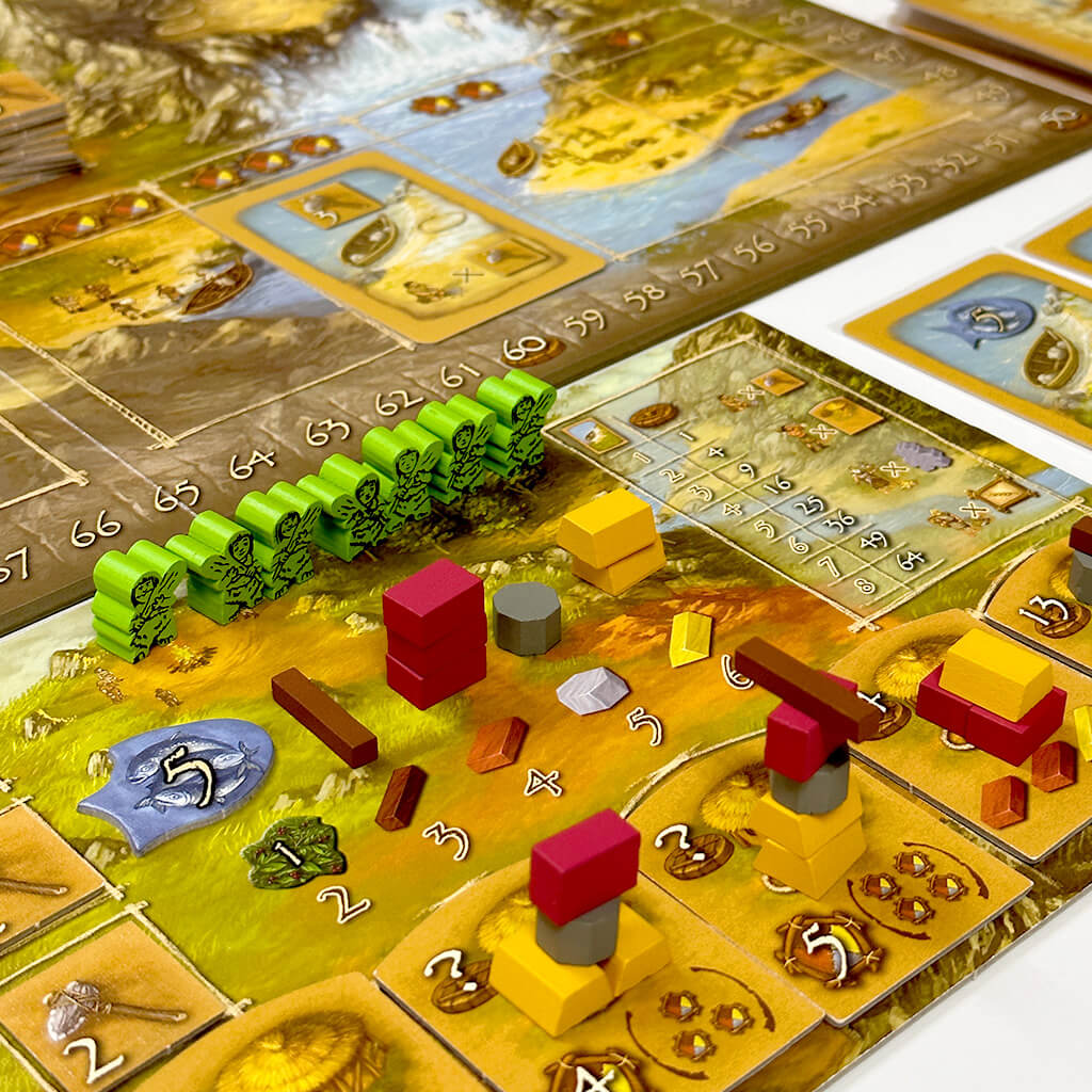 玩法轻松易懂又充满策略:你要派出工人上山砍木、下河捞金、种田盖房,甚至还能“添个娃”扩充劳动力!每回合选择不同的地点安排族人,掷骰采集资源,再利用资源建造房屋、发展文明。不过别忘了,每位工人都要吃饭,粮食不够可要挨饿扣分哦!游戏融合策略布局与运气机制,让每一局都充满变化与挑战。